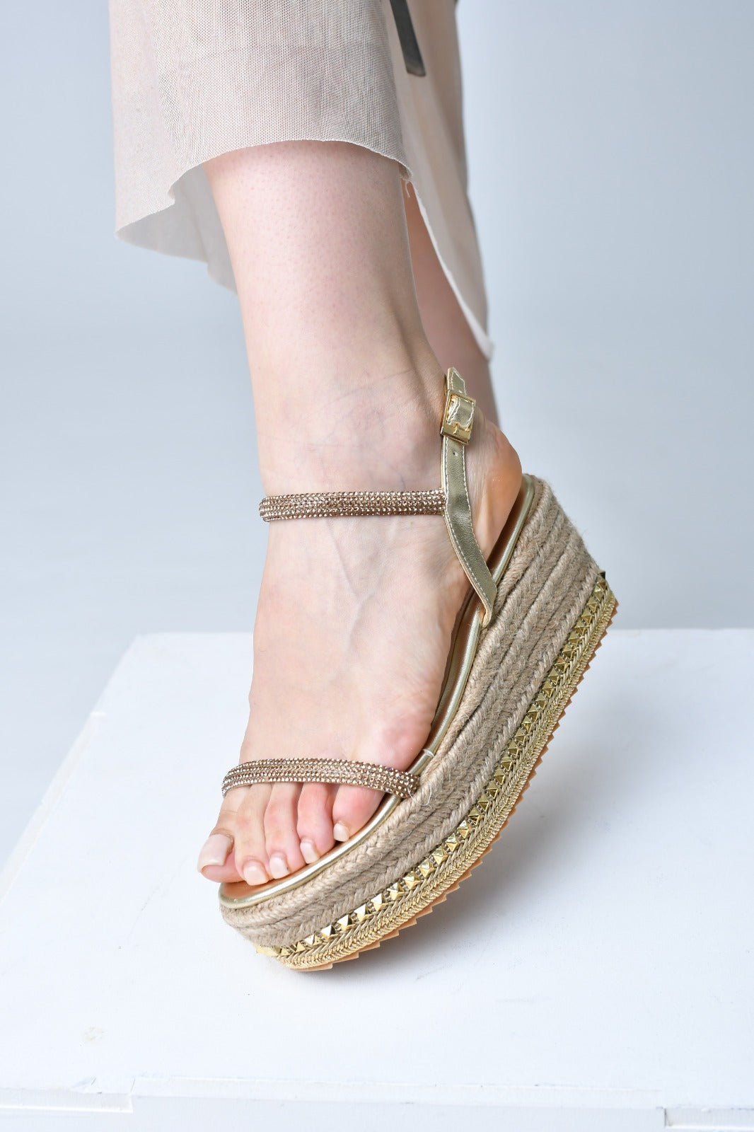 Acentos Dorados: Tiras de glitter y una sofisticada cadena que bordea la plataforma.