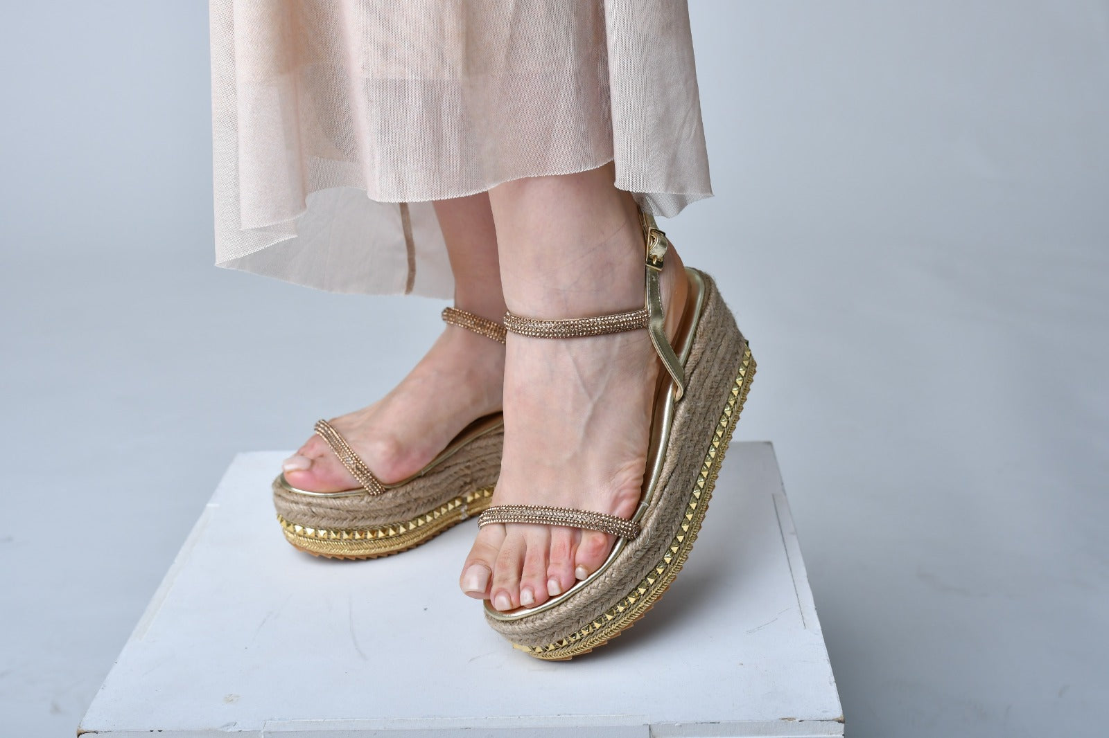Dana es la pieza que lleva el diseño artesanal del verano al terreno del glamour de fiesta. Esta alpargata de cuña alta fusiona la autenticidad del trenzado de esparto con acentos de brillo metálico y pedrería. La suela se distingue por un llamativo detalle de cadena dorada y una construcción robusta que ofrece máxima altura y estabilidad. Es el equilibrio perfecto entre la comodidad veraniega y la opulencia.